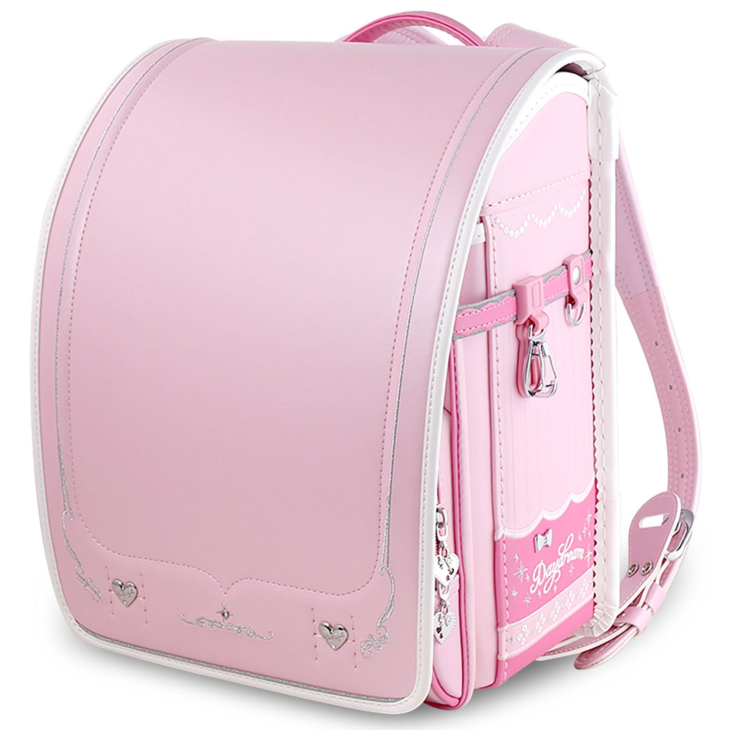 ・左側Dカン ・左側の刺繡・虹色反射材 ・右側の刺繡・虹色反射・金属 ・ハート型引き手 ・かぶせ裏 ・ナスカン・エンボス加工・パール型刺繡 |