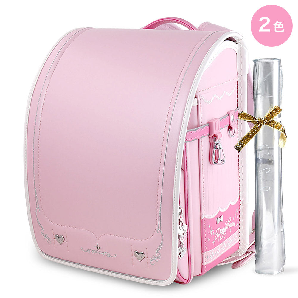 カブセにゴールドとシルバーの刺繍を施したランドセル、 丸く浅いシルバースタッズが高級感と控えめな印象を与え、 年頃の子供にはちょうどいい控えめな華やかさを演出しています。 |