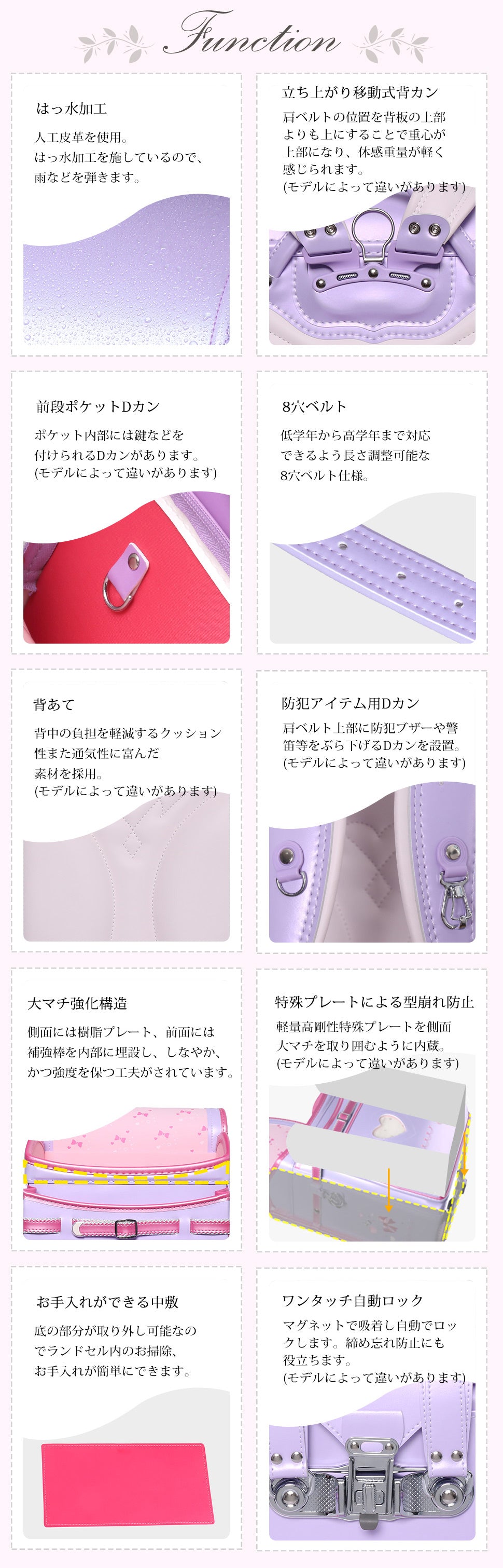 クーロン・キャッスル思わず一目惚れしてしまうフォルムやパーツ、 女の子なら誰もが憧れるプリンセスの世界へと誘います。 そんな思いをかなえてくれるランドセルです。 |